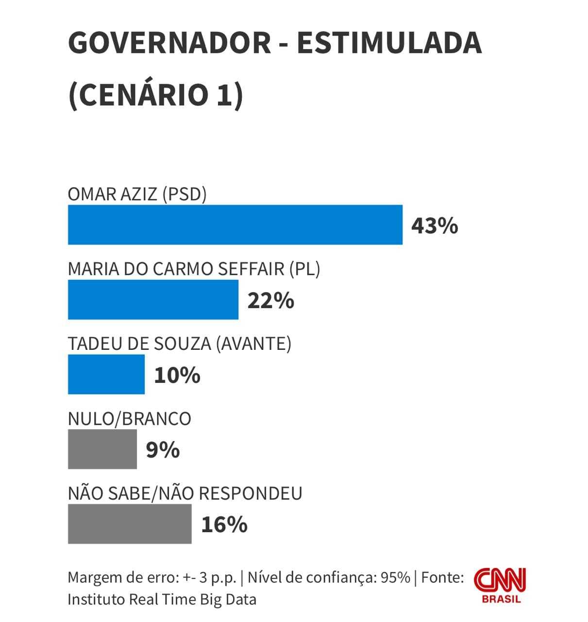 No primeiro deles, Aziz aparece com 43%. Pré-candidata ao governo, a empresária Maria do Carmo Seffair (PL) vem em segundo com 22%. Já o atual vice-governador Tadeu de Souza (Avante) tem 10%.